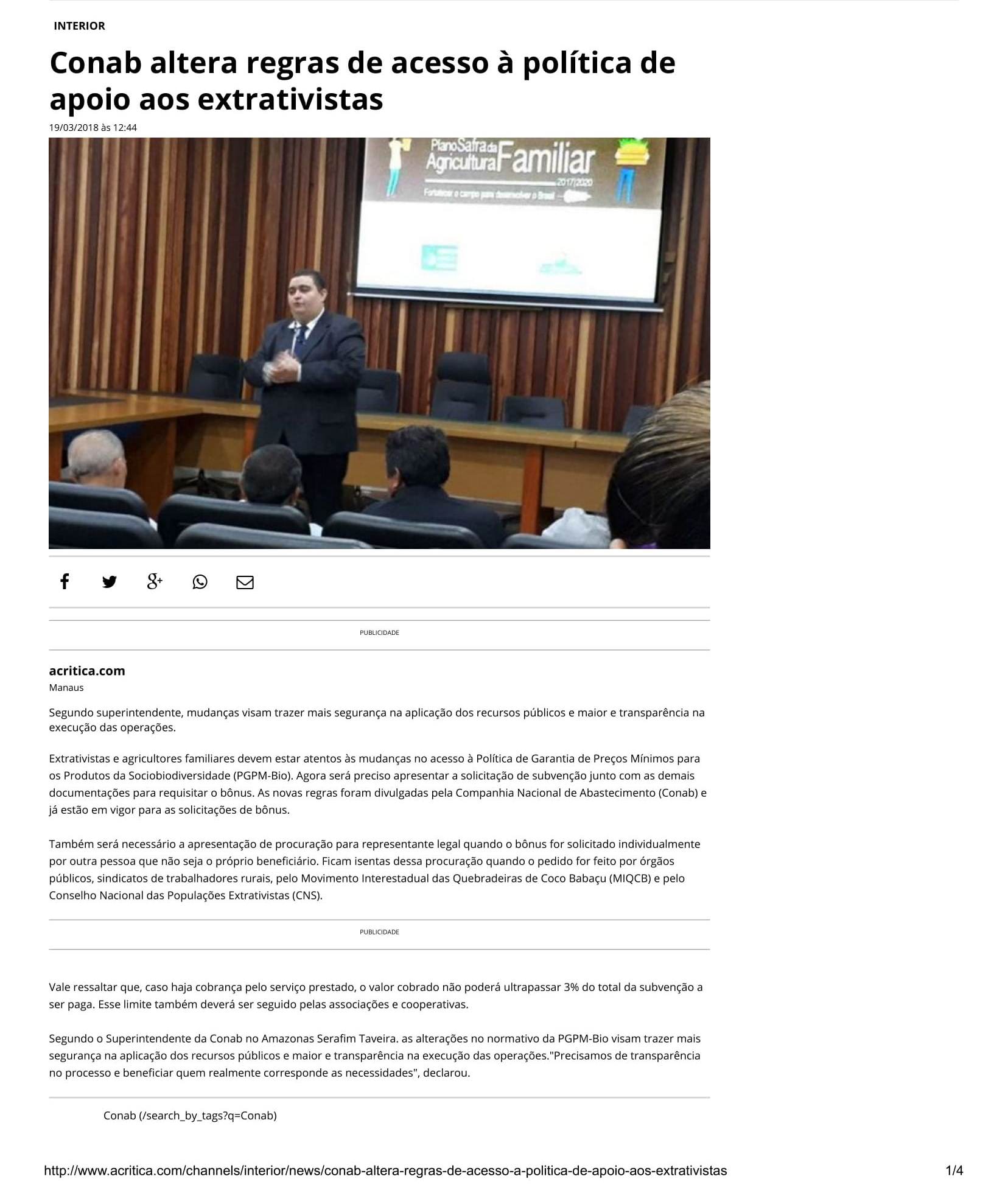 Conab altera regras de acesso à política de apoio aos extrativistas 19 de mar de 2018 | 09:42 Ouvir Compartilhar Tweet Compartilhar Tweet