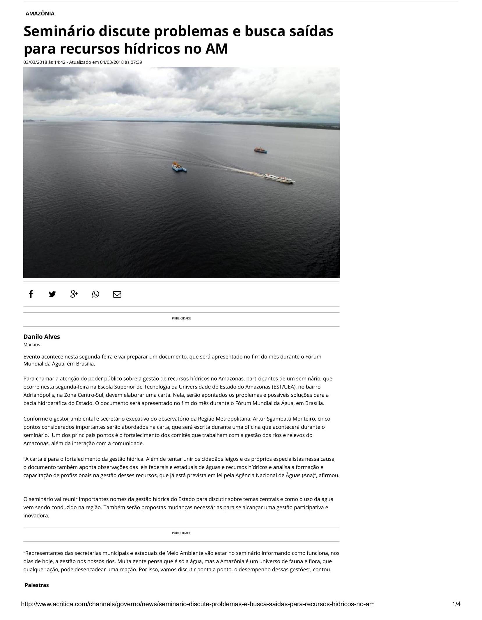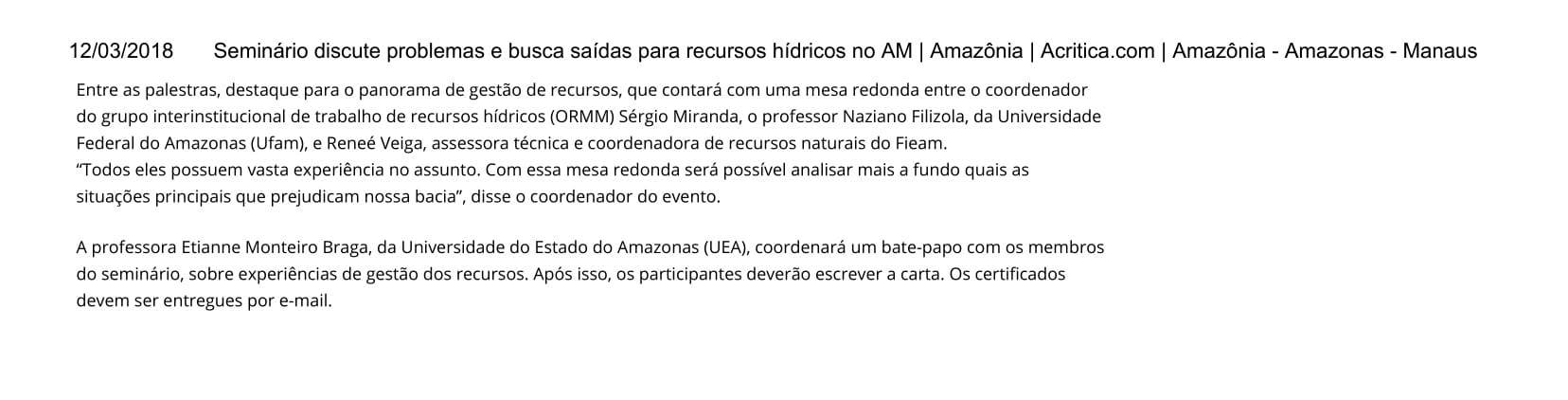 Seminário discute problemas e busca saídas para recursos hídricos no AM 03 de mar de 2018 | 10:40 Ouvir Compartilhar Tweet Compartilhar Tweet